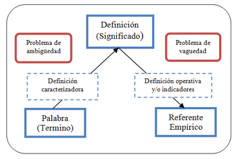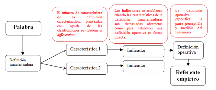 Con ayuda de la clasificación per genus et differentiam podemos establecer las definiciones caracterizadoras de los conceptos superando de esta manera el problema de la ambigüedad. No obstante, muchas de estas definiciones no son aun capaces de capturar directamente a los referentes empíricos a los que se refieren. Así “para colmar esta distancia entre intención de un significado conceptual y sus referentes empíricos hay que dar algunos pasos intermedios” (Pasquino, 1988). Esos pasos intermedios son: establecer definiciones operativas y/o indicadores que representan a la definición del concepto. Este proceso se le conoce con el nombre de operacionalización del concepto, el cual debe de realizarse con sumo cuidado (Ver: Figura N°4). Las definiciones operativas deben reflejar correctamente a los indicadores y estos últimos deben reflejar a la definición caracterizadora del concepto.