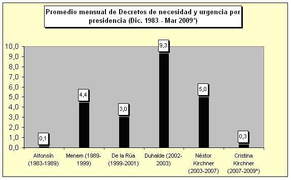 Los Decretos de Necesidad y Urgencia, son poderes constitucionales los cuales han permitido a los jefes de gobierno mantener una herramienta de redireccionamiento de la acción política, son, siguiendo a Mainwaring y Shugart, poderes proactivos porque permiten crear legislación. Como se observa en el cuadro 1, considerando extensiones de los mandatos y la eventual crisis de principios de siglo, observamos una caída en el uso de los mismos, los cuales nos hace suponer una mayor estabilidad institucional.