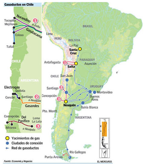 El mapa gasífero chileno está compuesto principalmente por tres gasoductos que provienen desde Argentina.