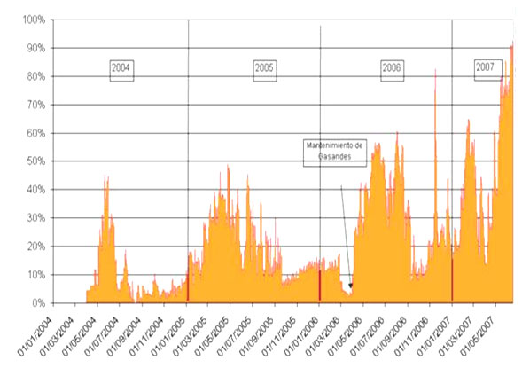 Según cifras estimadas por la Comisión Nacional de Energía en 2006, los envíos a cada gasoducto, considerando el supuesto de que están operando a un 100% serían: