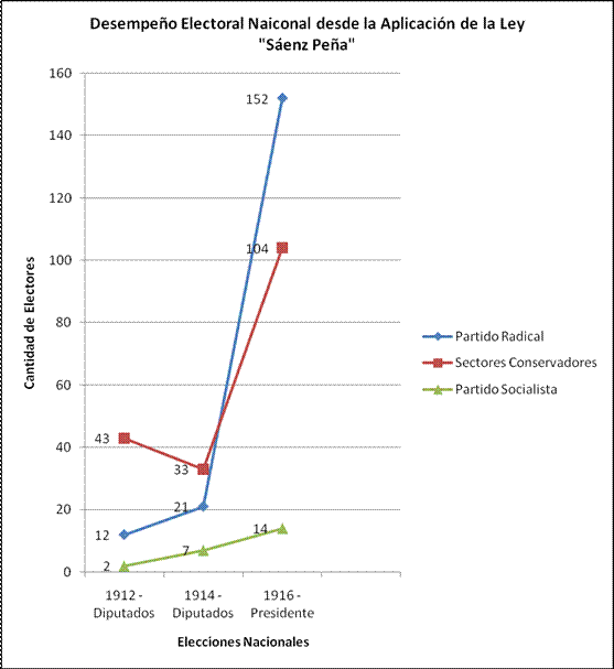 La primera elección en la que se aplicó la nueva ley electoral 8.871, conocida como ley “Sáenz Peña”, fue en las elecciones para diputados, de 1912. En la misma, el partido conservador obtuvo 43 diputados (destacan los 14 de Buenos Aires y los 7 de Córdoba). Mientras que las fuerzas minoritarias consiguieron en total 15 diputados (12 la U.C.R., 2 el Socialismo y 1 la Liga del Sur). Estos primeros resultados, permitirían reflexionar en esta primera instancia, la Reforma como realmente efectiva para Sáenz Peña, habiendo podido conseguir todo lo que se había propuesto. Es decir, excluyó al Roquismo, abrió el juego político a nuevos actores (confiriéndole más legitimidad a su plan, ya que efectivamente repartió ciertas diputaciones y no fue una mera instancia retórica), pero a su vez los mantuvo contenidos como una débil minoría.