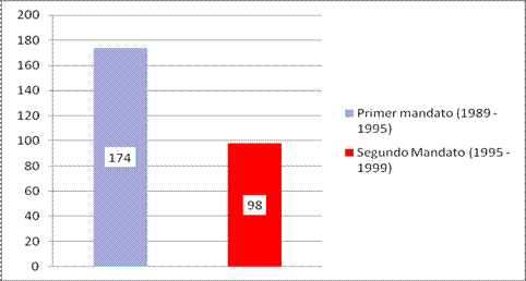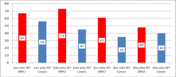 Los datos son contundentes: el primer gobierno democrático desde 1983 firmó solo 10 decretos, mientras que el último llegó a 249 y con provisión de delegación de facultades permanentes en diversas materias; alcanzándose así la suma total de 1035 decretos a lo largo de 24 años de democracia.