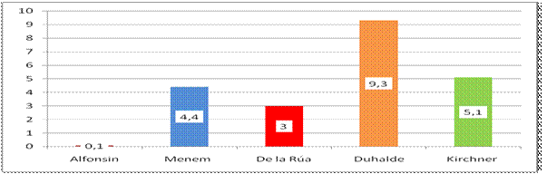 Si bien Alfonsín firmo un promedio de 0.1 por mes, Menem lo hizo a 4.4, mientras que Fernando De La Rúa se alzó con un nivel de 3 decretos por mes. Por otro lado, Duhalde registro un valor de 9.3 por mes y Néstor Kirchner 5.1